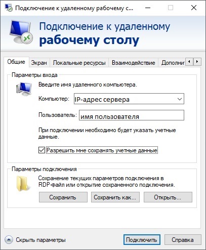 Компьютер — введите IP-адрес удаленного RDP-стола.