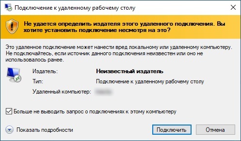 В процессе подключения к виртуальному серверу выводится предупреждение о невозможности проверить подлинность издателя. Поставьте галочку «Больше не выводить запрос о подключениях к этому компьютеру» и кликните «Подключить».