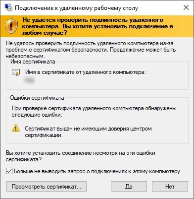 (wacko wrapper=text wrapper_align=justify)В процессе подключения к виртуальному серверу выводится предупреждение о невозможности проверить подлинность издателя. Поставьте галочку «Больше не выводить запрос о подключениях к этому компьютеру» и кликните «Подключить».